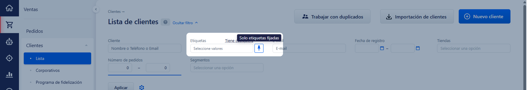Junto al campo de selección de etiquetas hay un icono en forma de chincheta, que incluye el modo de búsqueda "Solo etiquetas fijadas". Una etiqueta fijada es una etiqueta que se marcó manualmente en la tarjeta del cliente para resaltarla; siempre aparece primero en la lista de etiquetas. Un cliente solo puede tener una etiqueta fija.