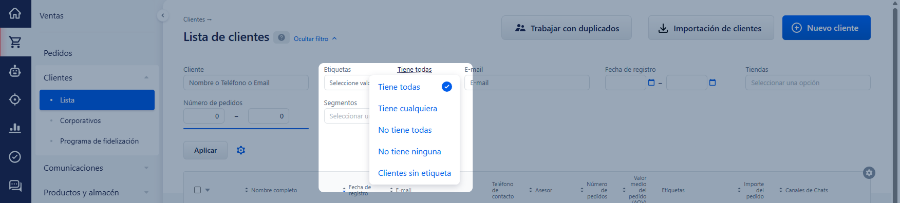 - "Clientes sin etiqueta" — solo se mostrarán los clientes a los que no se les haya asignado ninguna etiqueta.