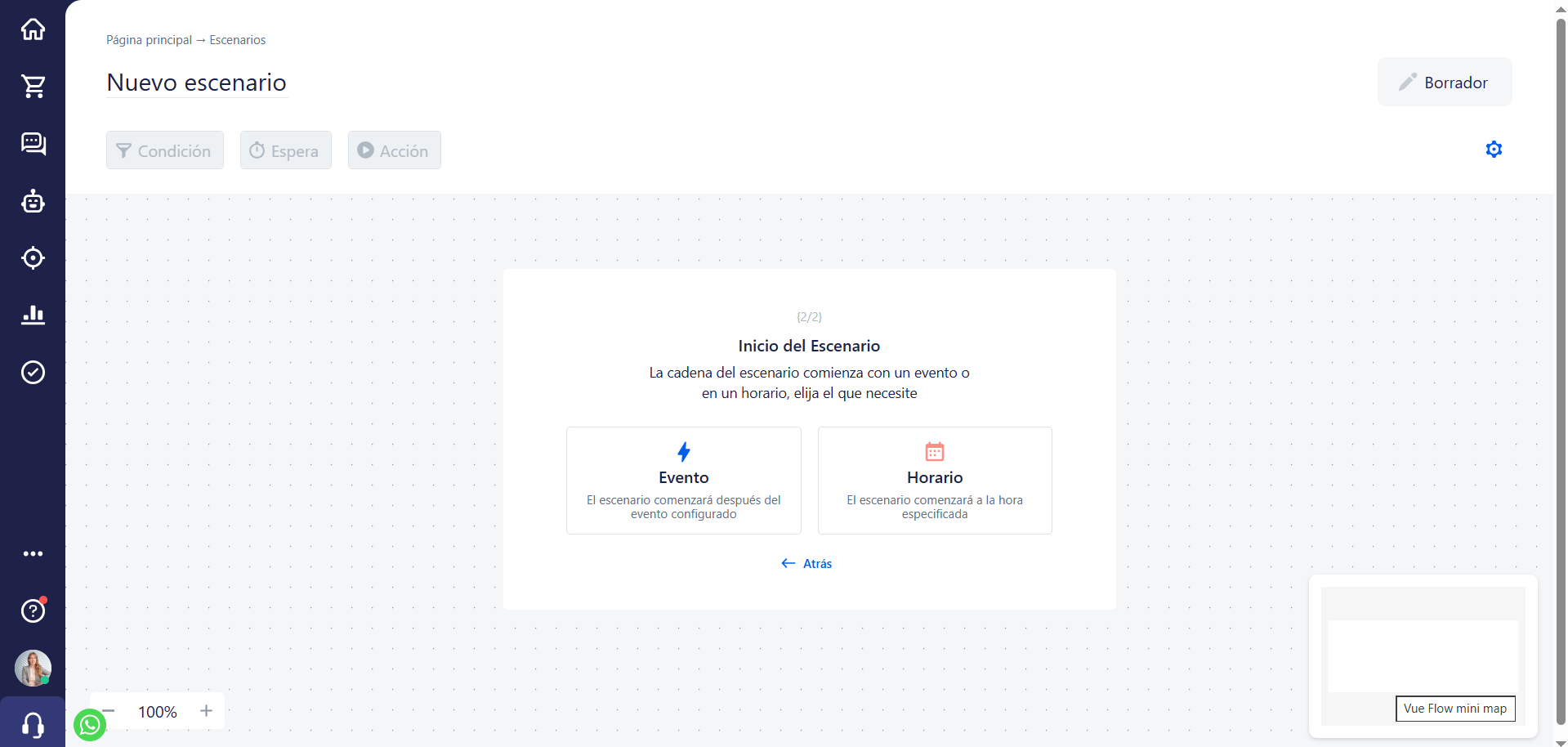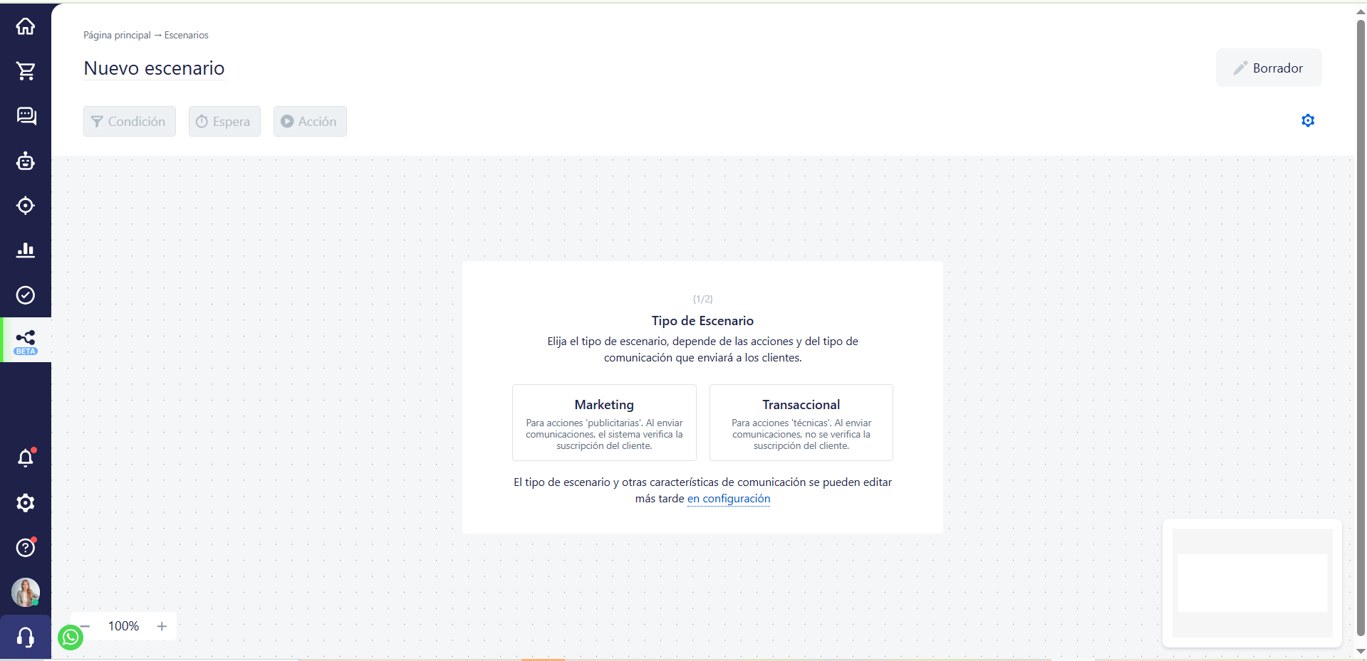 Al abrir la pestaña "Escenarios", aparecerá un campo para crear un escenario de acciones. Inicialmente, es necesario seleccionar el tipo "Marketing" o "Transaccional".