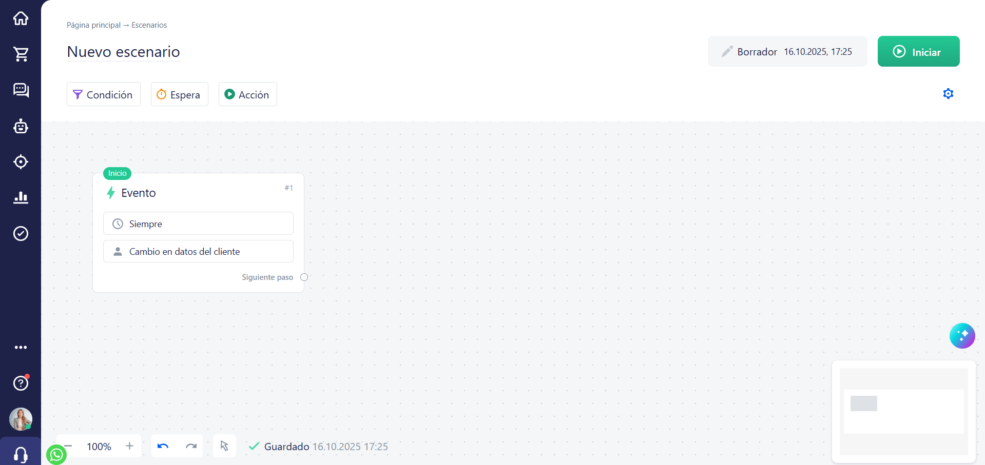 Después de realizar los pasos preparatorios, estará disponible el área de trabajo para configurar el diagrama de flujo del escenario.